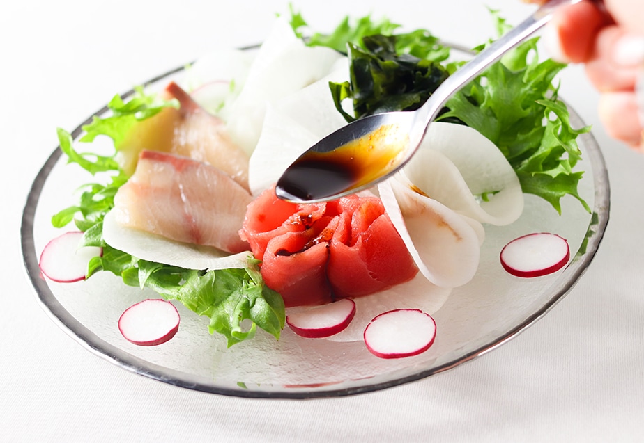 そんな中、名乗りを上げたお醤油屋さんは大正時代から島根県で美味しいお醤油を作り続ける老舗、その名も大正屋醤油店さん。お醤油のプロであるそのメーカーさんにとってもオイルとお醤油の調合はしたことのない挑戦でした。何度か試作した末に、ある工夫を施すことで分離しない美味しいわさび醤油が出来上がりました。そしてその工夫の結果、たくさんの生わさびを贅沢にお醤油に溶いたときのトロッと感まで再現できたのです。