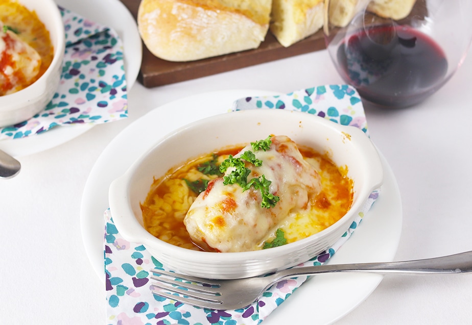湯せんをするだけのロールキャベツをちょっとだけアレンジした簡単レシピ。やさしい味わいにチーズの濃厚さをプラスして。