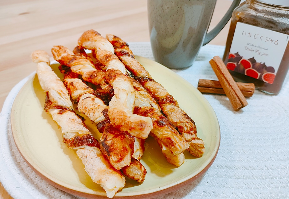 ②2㎝幅程度に切り分けたパイシートの上下1㎝ほど余白にして、いちじくジャムを小さじ1ずつまんべんなく広げます。