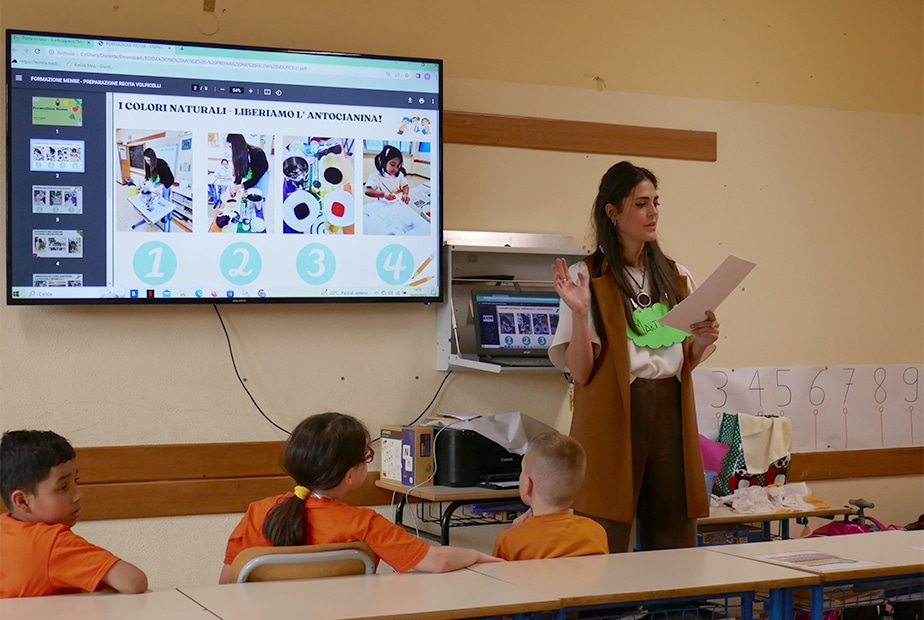 対象クラスは小学校の2年生。7歳の子供たちです。先生はスローフード大学とも呼ばれる、ピエモンテの食文化科学大学で学んだマルティーナさん。授業は10回x2時間のカリキュラムで、数か月にわたり行われます。最終日はこのクラスで学んだことを保護者の前で披露する発表会で締めくくられます。