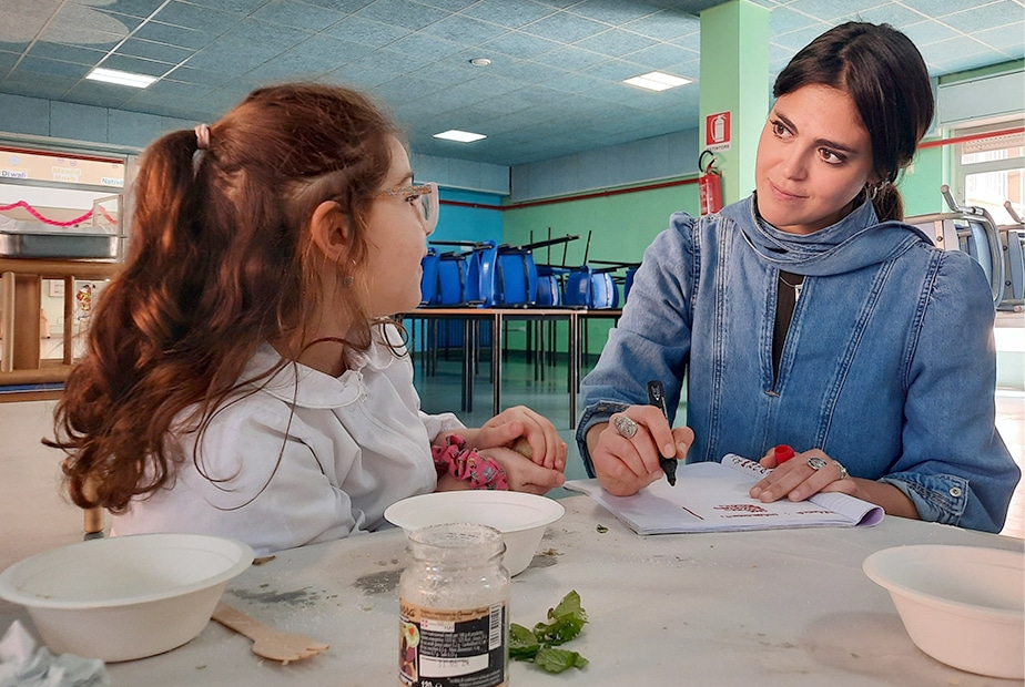 そしてこれらの授業の中で特に驚いたのは、赤キャベツや赤い野菜に含まれる栄養素アントシアニンからくる自然の色と添加物による人工着色の違いを教えていたこと。7歳の児童に対して‘アントシアニン’の説明をするとは!思わずマルティーナ先生にその話題は早くはないかとおそるおそる聞いたところ「生徒たちは明日になればアントシアニンという言葉は忘れるかもしれません。でもこの年齢からこういった話題に慣れること、これが大切なのです。」ときっぱりと答えてくれました。さらには「社会格差や国籍関係なく、すべての子どもたちが正しい食育を受け、大人になってからではなく子供のうちから食の重要さを学ぶ。これはローマ市が今もっとも力を入れている政策の一つなのです。」と続けるマルティーナ先生。事実、この小学校はローマ郊外の移民の家族が多く住む地域。自治体のプロジェクトとして、こういった最先端の食育が一部の私立小学校ではなく、広い範囲の地域で行われているのです。「食材の鮮度や品質に敏感になること、食の安全性を理解すること、そしておいしいものを楽しみながら食べること。これらのことを学ぶ食育は数学や国語の授業よりも大切なのです。」なるほど。たしかに食について小学校から学ぶのは自然で、だれにとっても有益な取り組みであるはず。