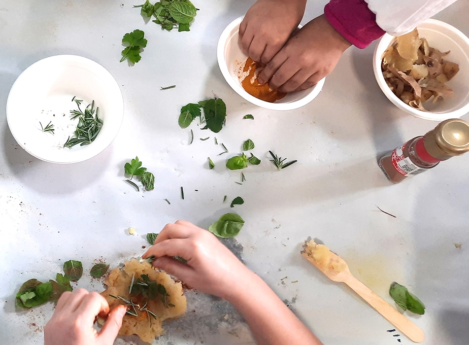 ハーブやスパイスでコロッケ作り。多種類のハーブやスパイスを混ぜ込んだジャガイモのコロッケをみんなで作り、試食。