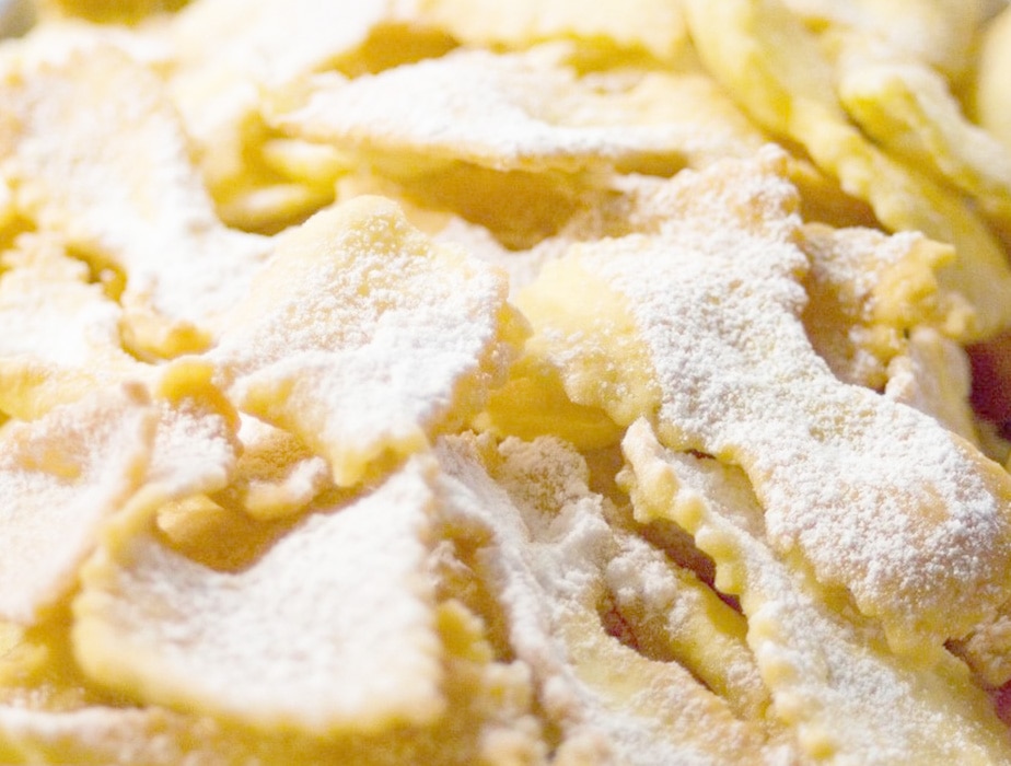 カーニバルのもう一つのお楽しみはお菓子。地方ごとにそれぞれのカーニバルのドルチェが存在し、そのほとんどが揚げ菓子です。最も代表的なものがキアッキエレ。‘おしゃべりをする‘という意味のこのお菓子は、小麦粉の生地を薄くのばしフライにして粉砂糖をかけたもの。素朴な味わいで食感もサクサクと軽く、いくらでも食べられてしまいます。