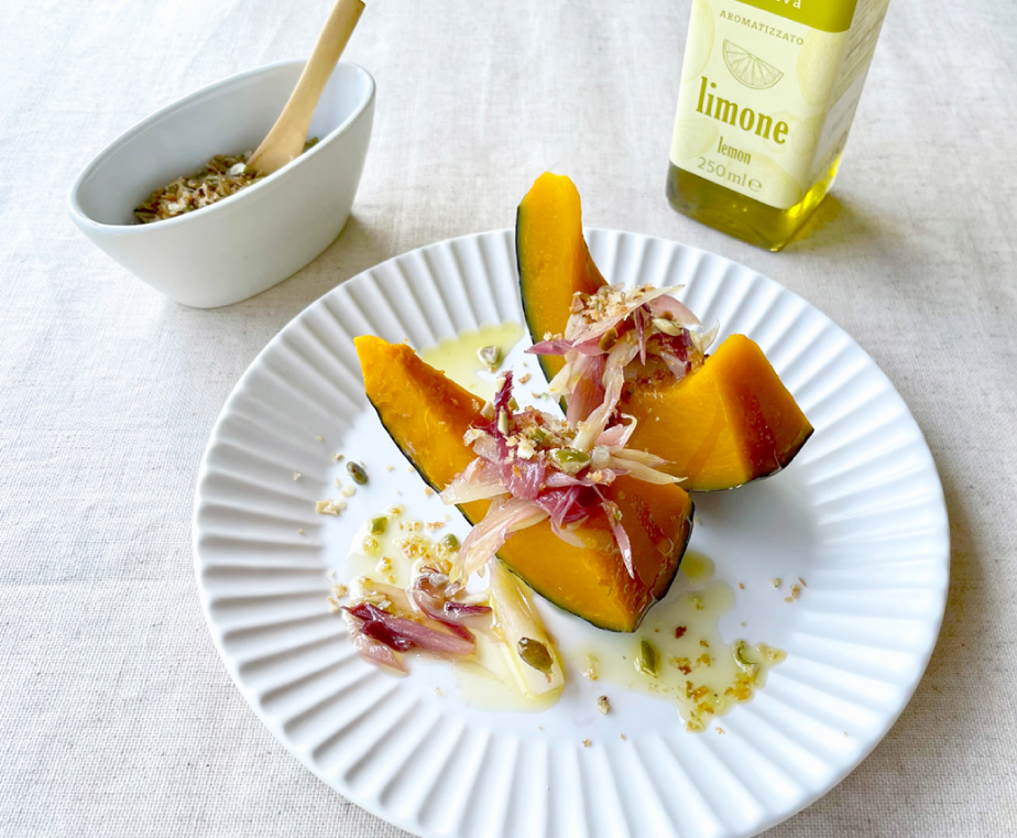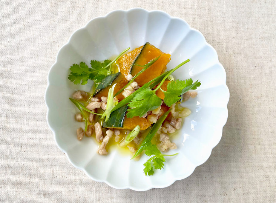 ②蒸したカボチャとともに盛り付け、細ねぎの斜め薄切りとパクチーを散らし、レモンオイルを回しかけて仕上げる。