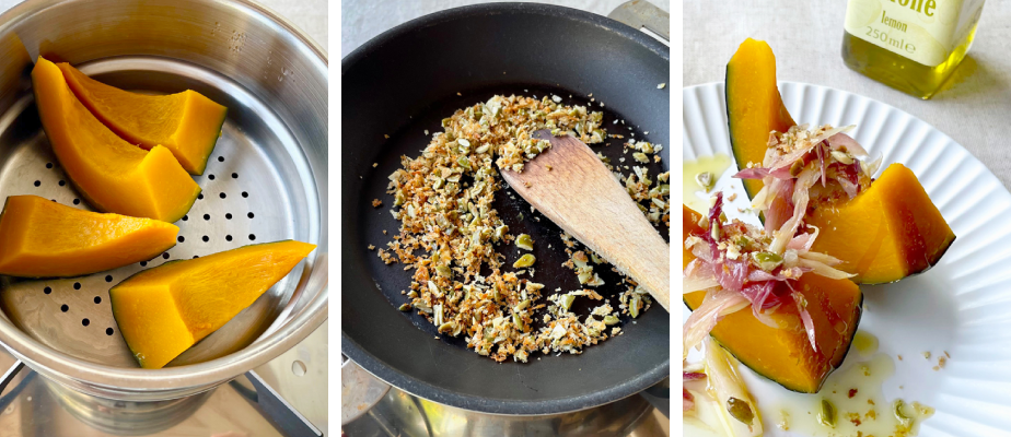 ③あとのフライパンにレモンオイル(小さじ1)とにんにく(みじん切り)を入れて火にかけ、軽く炒める。乾燥パン粉を加えて香ばしく炒める。薄茶色になったら粗く刻んだカボチャの種を加え炒め、塩を振る。
