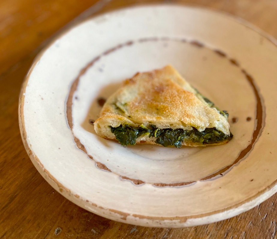 〈ティエッラ〉や〈ピッツァ・リピエーナ〉とも呼ばれ、エンダイブ(*1)やビエトラ(*2)、ほうれん草など、一般的に野菜を炒めたものが具材に使われます。生野菜ではなく、調理した野菜をたっぷりと詰めるので結構食べ応えがあります。包む生地もバターが入ったもの、卵が入ったもの、もしくはシンプルに小麦粉と水、オリーブオイルだけで練り上げたものと地方によっていろいろでパリッとした生地もあれば、もちっとした生地もあります。