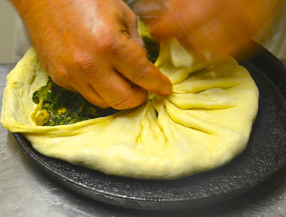 昔は「アル・ソル」と呼ばれる銅製の丸い型に入れてパン焼き窯で焼かれ、レッジョ・エミリアの街中で、そのおいしさを競い合っていたそう。現在では具材にはビエトラという葉野菜やほうれん草が使われます。