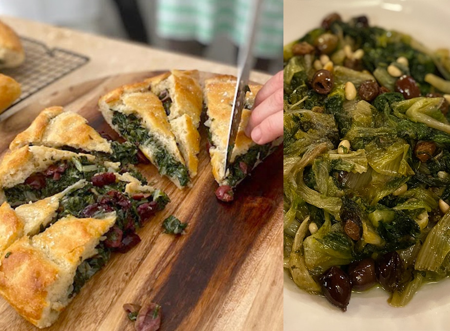 (写真左:出来上がりをカットしたもの。写真右:エンダイブを炒めた具材。)
