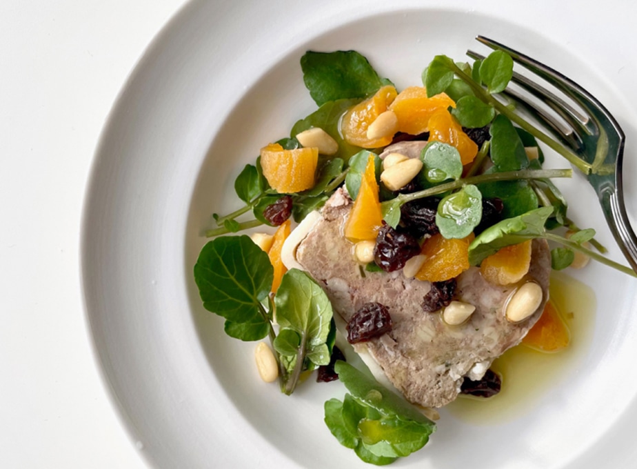 クレソン、松の実、レーズン、アプリコットをパテとともに盛り付け、ヴィネグレットソースをまわしかける。
