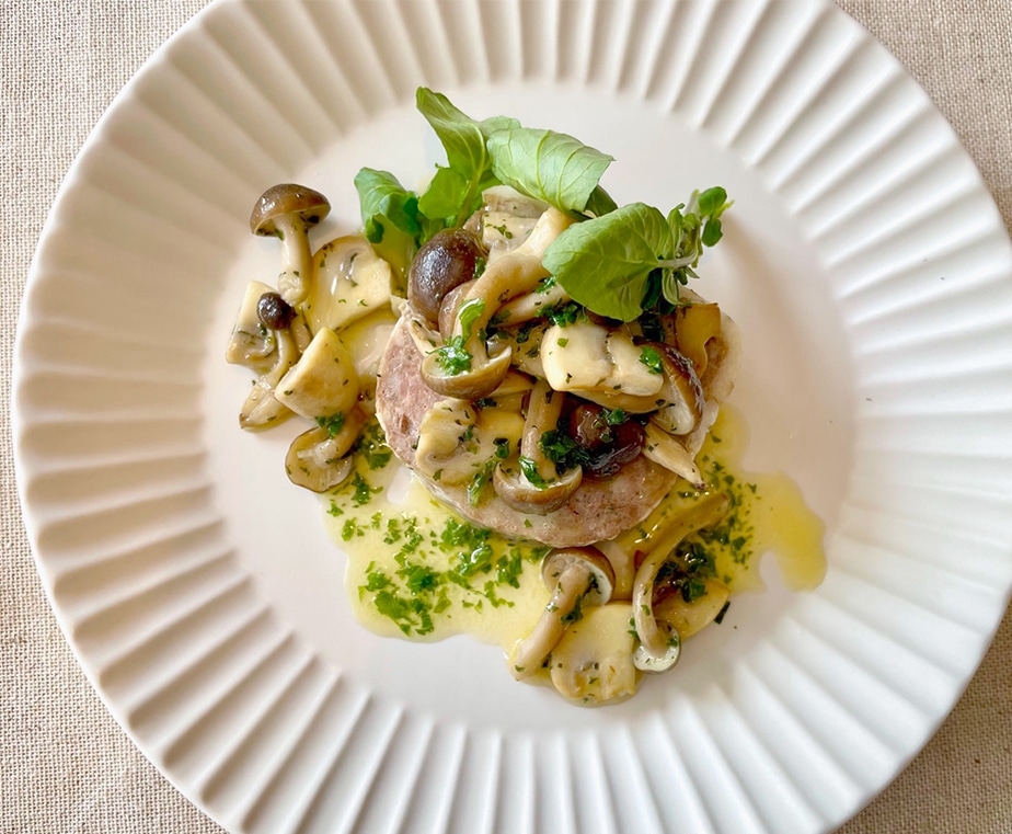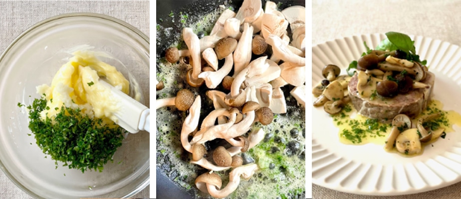 ③皿に盛り付けたパテに炒めたしめじとマッシュルームをのせる。後のフライパンを火にかけ、残りのにんにくパセリバターを溶かし、パテの周囲にまわしかける。クレソンとレモンを添える。