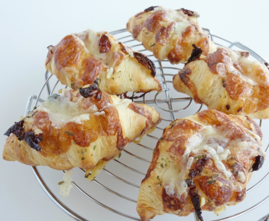 ②ドライトマトは細切りにする。グリエールチーズはチーズおろしで細長くおろす。ミニクロワッサン生地の表面が汗をかいたようになったら、その上にドライトマトをのせ、チーズのおよそ1/3量をトッピングし、オレガノまたは、セージを散らす。