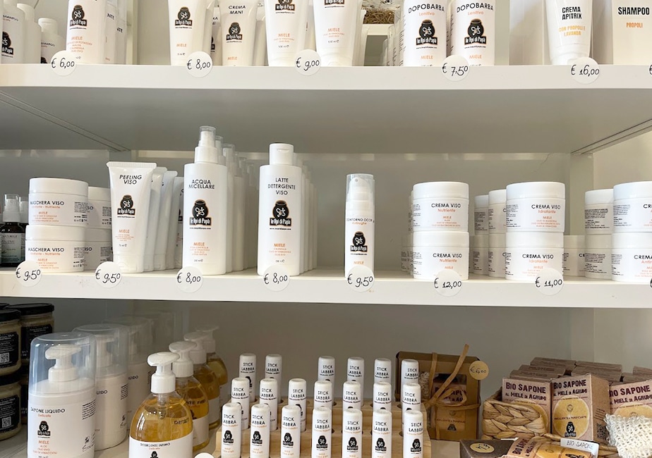 「Le Api di Papa(レ・アーピ・ディ・パパ)」という自社ブランドで、養蜂家ディエゴ・アルフィデオさんが採取する20種類近くのハチミツ、さらには栄養補助食品、コスメ商品も取り揃えられています。