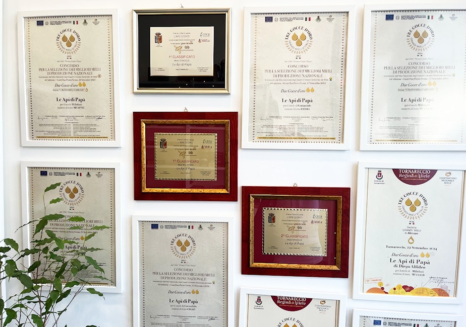 こうしたこだわりの生産方法が高く評価され、ディエゴさんのハチミツはイタリアのハチミツコンクールで数々の賞を受賞。お店の壁は賞状で埋め尽くされています。