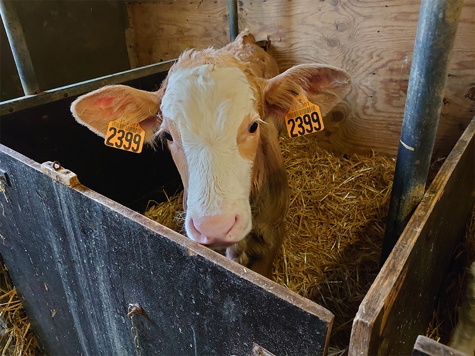 (生後数週間のモンペリアルド種の仔牛です。大切に育てられ、このあと2年半ほどで初めて乳が取れるようになります。)
