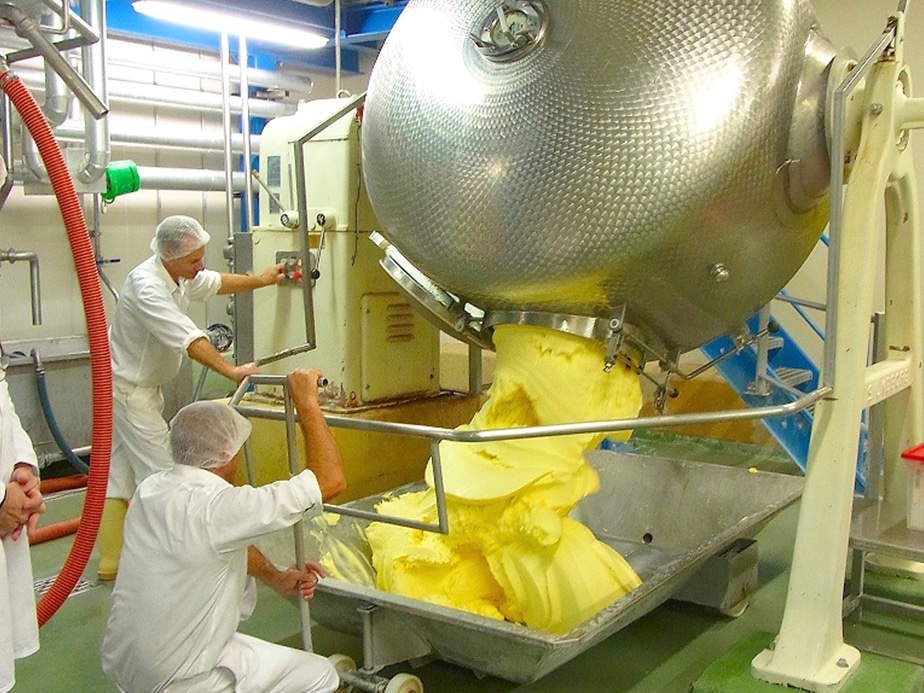 この発酵クレーム(クリーム)は次いで撹拌器にかけられ、脂肪分と水分(バターミルク)に分離させます。