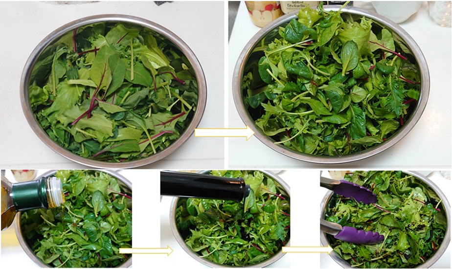水気をしっかり切った葉野菜にはオリーブオイルとバルサミコ酢をかけて全体を和えてから盛り付けます。