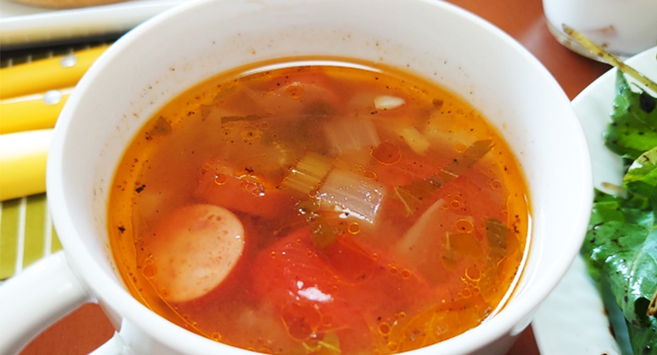 あとはセロリ、玉ねぎ、ニンニク、チキンストックに塩・コショウでシンプルに煮たスープ。