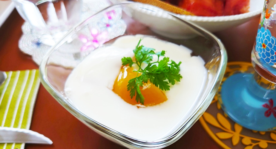 黄桃のシロップ漬けを4等分に切って、小皿にヨーグルトと一緒に盛り付けただけ!