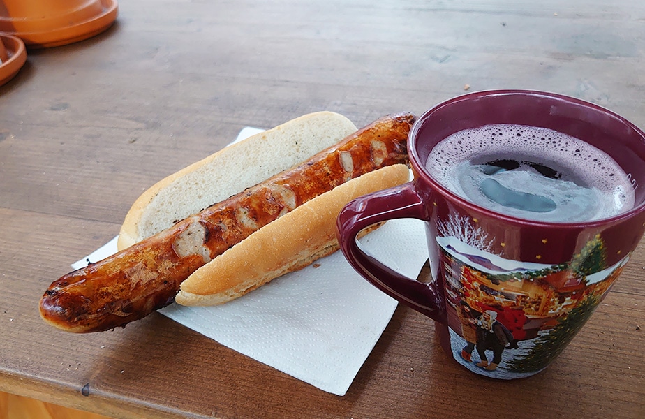 ソーセージはドイツらしくお肉の旨みにあふれ、しっかりしたボリューム。パンは添え物程度にも見えますが、シンプルな味わいなのでソーセージにはぴったりです。そしてほんのり甘くてスパイスの効いたホットワインが体を更に温めてくれます。