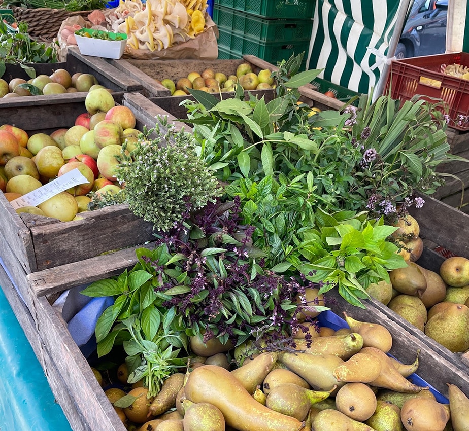 パリ近郊のBIO農家のスタンドには秋の味覚が一堂に。手前はコンフェランスという品種の梨、その向こうには まだ小粒のリンゴ、そしてキノコも見えます。花をつけたハーブが売られるのも10月の今頃です。