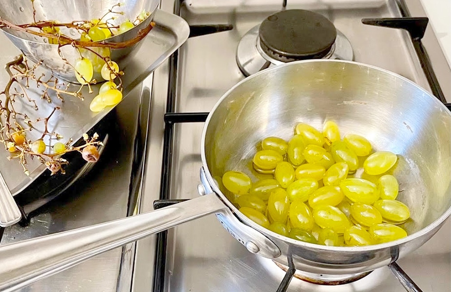写真はこれをブッラータに添えたところ。日本の種無し葡萄は大粒がほとんどですから、同じようにはできないでしょう。熟し方が足りないとソースがとれないので未熟なものは選ばず、半分にカットして作ってはいかがでしょう。