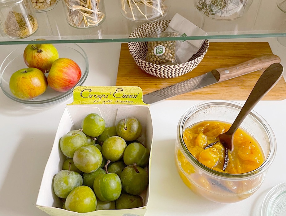 灰色がかった緑のプラムはレーヌクロード。オレンジ色のコンフィチュールは出盛りの頃に作っておいたミラベルのコンフィチュール。