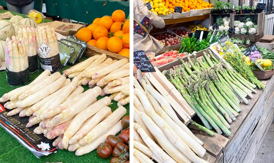盛り土した土中で育てるホワイトアスパラガスの他、収穫間際に穂先だけ陽の光に当ててうっすら紫色になったヴィオレ、そしてグリーンアスパラガス。 ホワイトアスパラやヴィオレは一本80grから100gr程度のものを束ねて1キロ前後で売っていることが多く、1束20ユーロ前後。 グリーンアスパラは太いものから細身まで姿は色々です。 ただいずれも、束になって包まれていると根本を見てこその鮮度がわかりにくいこともあり、バラ売りを好んで買う人も少なくありません。 根元に爪を立ててしっとりしていればOK。乾き切っていれば買うのはやめておこうという具合です。 そしてホワイトアスパラなら表皮が真珠色で艶が良いものを。 グリーンアスパラなら葉緑素の色が濃く艶良く、穂先ができるだけ閉じているものを選びます。