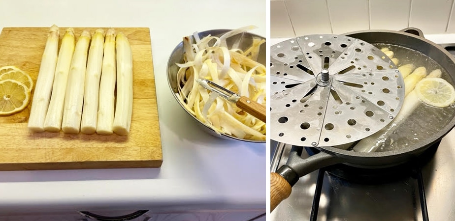ホワイトアスパラガスの調理法はいくつかあります。 茹でる、蒸す、そしてソテー、オーブンロースト。 いずれもエコノムと呼ばれるナイフを使って表皮を剥き、太さによって7分から10分弱茹でたり蒸したり。 ソテーやローストではそれとは別のコリッとした食感が楽しめるのが魅力です。