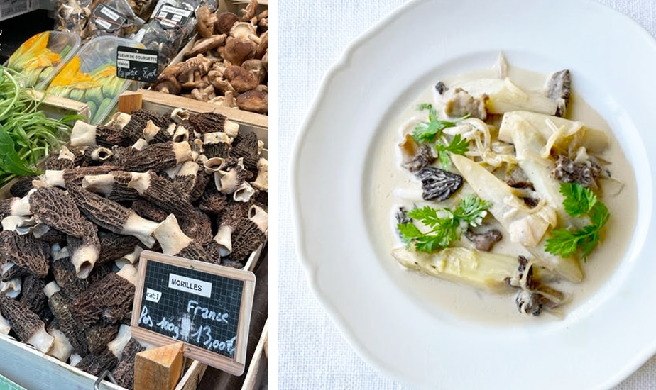 ホワイトアスパラガスと同じ時期に旬を迎えるのが春キノコのモリーユです。 こちらはエシャロットと皮を剥いて斜め切りにしたアスパラガスをバターで炒め、モリーユとともに蒸し焼きし、白ワインとクリームでソースを作ります。