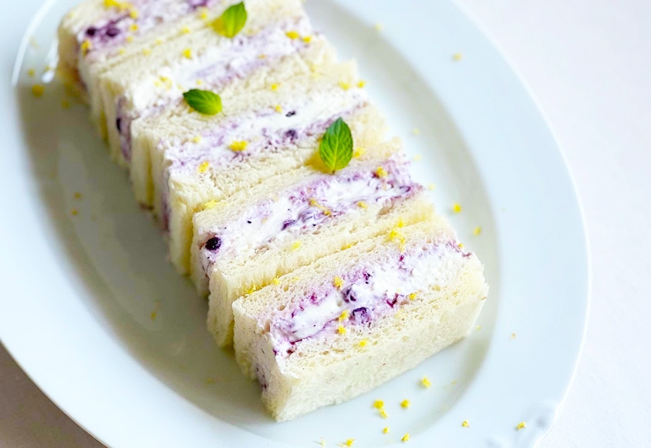 日本を代表するパンといえば、白くて柔らかいふわふわした食パン。ジャムを使えば紫色が美しく彩る、マーブル模様のフルーツサンドが簡単に出来上がります。ブルーベリージャムの甘みと酸味を生かし、水切りヨーグルトを加えたホイップクリームと合わせました。