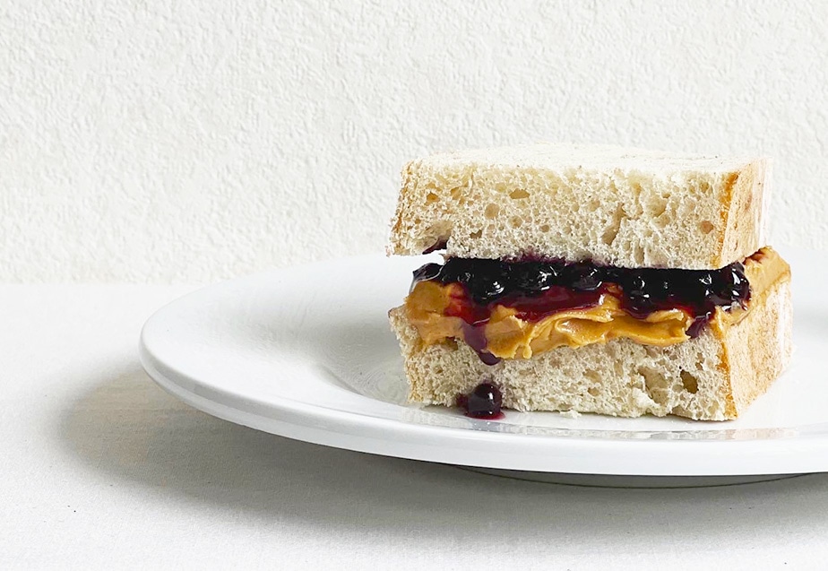 ピーナッツバターとジャムの組み合わせは、アメリカの国民的サンドイッチ!ジャムはベリー類が定番で、ここではブルーベリージャムと合わせました。パンはトーストしてもしなくても、ピーナッツバターとジャムもお好みの量をサンドして楽しんで!