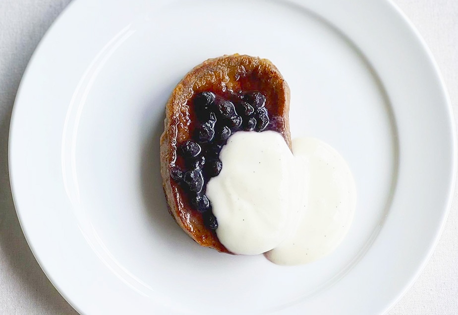 世界中で愛されているフレンチトースト。その発祥は諸説ありますが、アメリカ人のジョセフ・フレンチさんが名づけた料理という由来もあるそうです。ここではメープルシロップとブルーベリージャムを合わせたソースに、バニラ風味のチーズクリームを添えました。