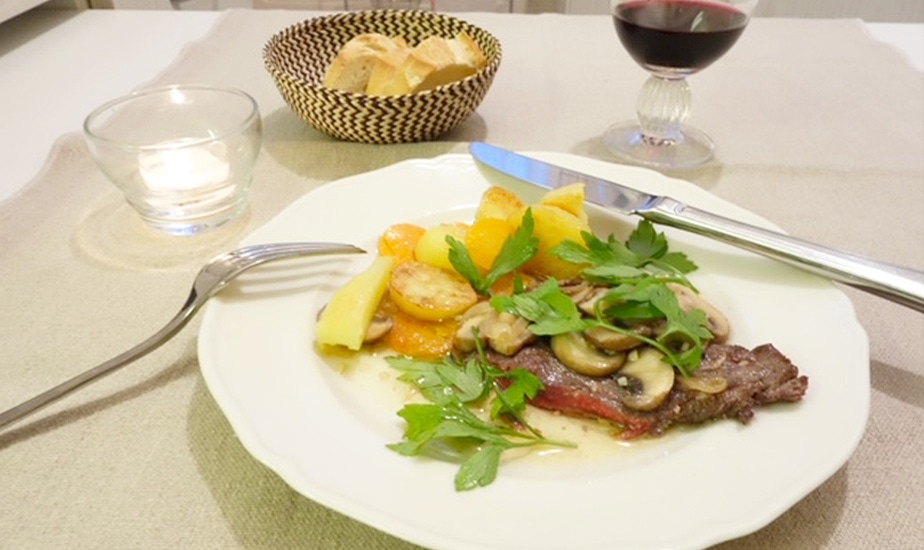 にんにくのすりおろし、塩、オリーブオイルで下味付けしたバヴェットをミディアムレアに焼いて。