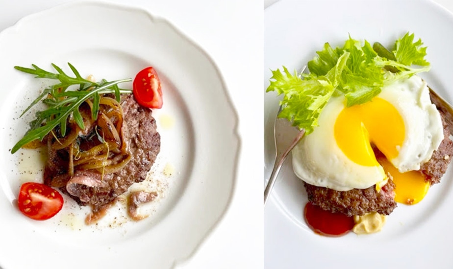 牛肉100%で挽きたてのフレッシュですから、焼き具合はレアからミディアムまで好みで。カフェのステーク・アッシェ風に半熟の目玉焼きをのせて、やわらかい黄身をソースのように挽肉に絡めて食べるのは美味しいものです。日本の店頭に並ぶ挽肉は脂も多く、挽いてから時間が経過しているので、もも肉などを塊で買って包丁で粗くたたく一手間がかかりますが、是非お試しいただきたいフランス風挽肉のステーキです。