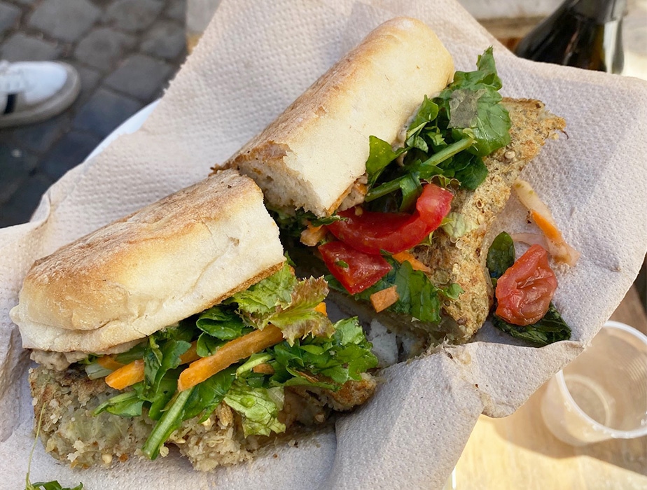 ここに野菜のパニーノが名物という屋台があるのですが、例外にもれずパンはチャバッタ。人気はナスのパニーノ。ナスのハンバーグ(つぶした焼きナスにパン粉とパルミジャーノチーズ、オリーブオイルを入れてハンバーグ状にして焼いたもの)とルーコラ、ニンジン、トマトなど、たくさんの野菜を挟んだサンドイッチです。