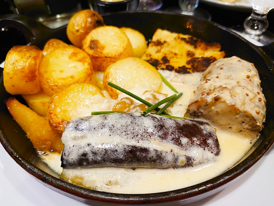 アンドゥイエットとブーダンノワールがたっぷりのじゃがいもと一緒にアツアツの鉄板に載って、マスタードクリームソースがたっぷり! どちらもダイニングプラスで販売しているサイズの1本を半分に切った状態でこんがり焼かれています。