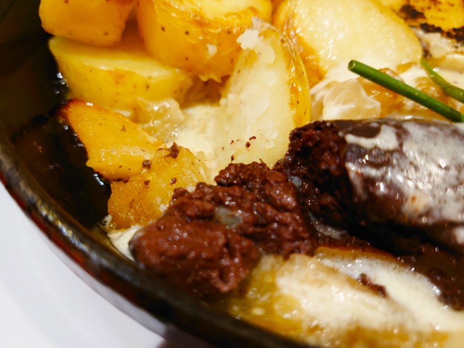 ブーダンノワールは一般的なパリッと肉肉しいタイプのヨーロッパのソーセージとは違ってふんわりした中身が特徴。 どちらかというと、こんがり焼かれた皮よりもその中身を焼いたリンゴに絡めて食べるイメージです。