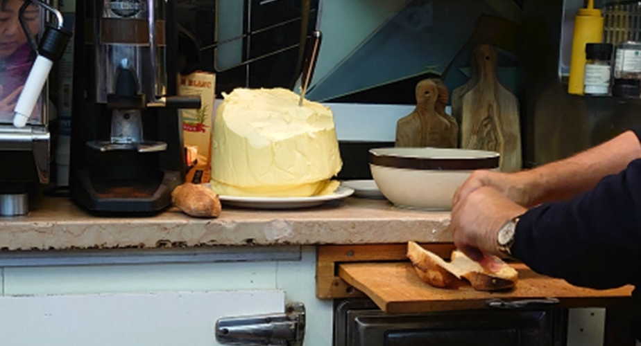 次は目の前のバターの山に突き刺さったバターナイフを手に取ってたっぷりのバターをサッとひと塗り。ナイフをバターの山に戻すと素手でハムとチーズを順番にまんべんなく敷き詰め、最後に真ん中で半分に切って出来上がり。