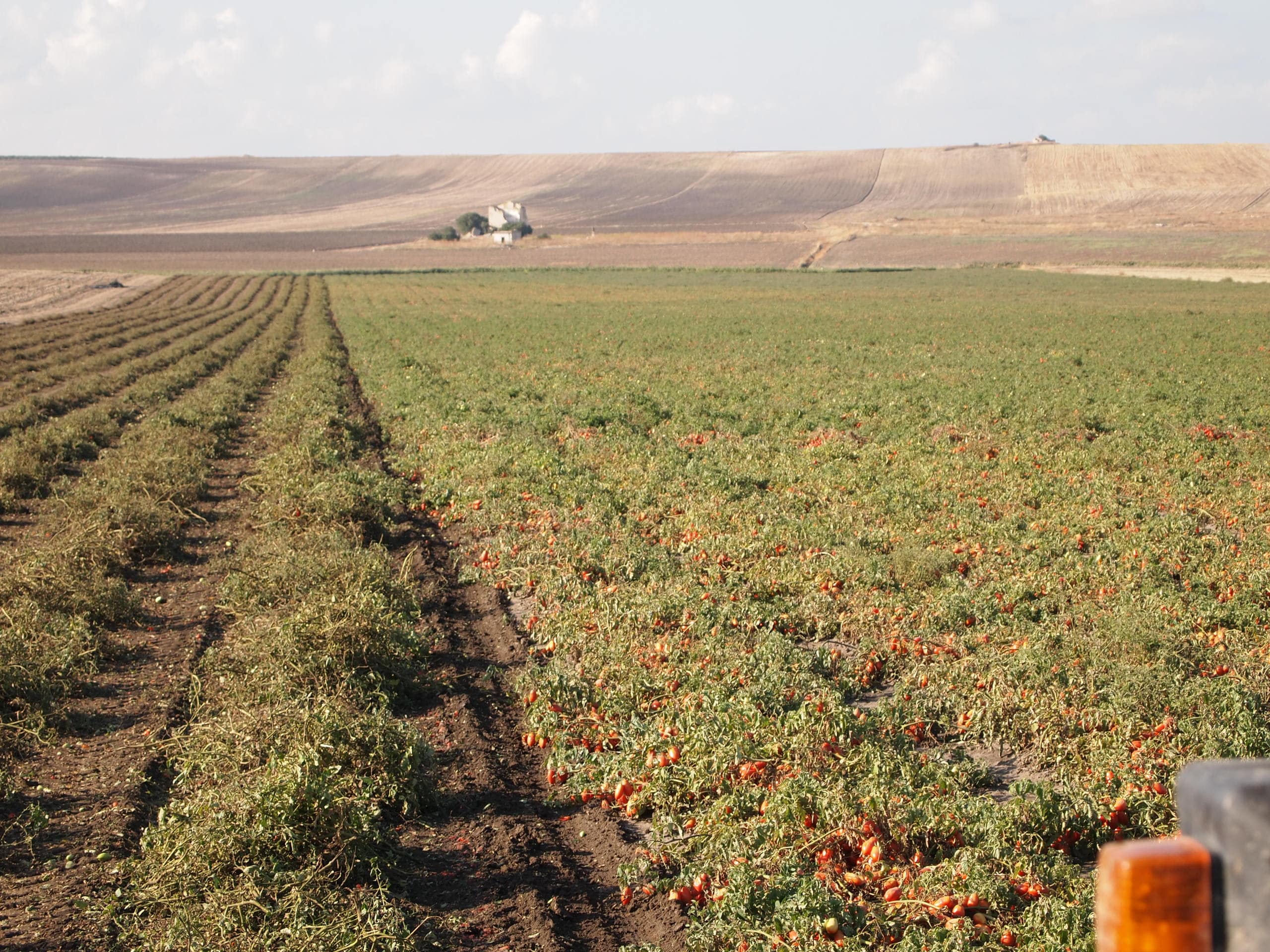 実際にその場に入ると、そこには灼熱の太陽の日差しが降り注ぎ、カラッカラの大地がただただ広がっています。 車から一歩外に出ると「暑い」ではなく「痛い」という体感。そのカラッカラの大地には乾きかけた緑が広がり、地平線まで続いていて、よく見ると地面がなんだか赤っぽい。それがトマトでした。
