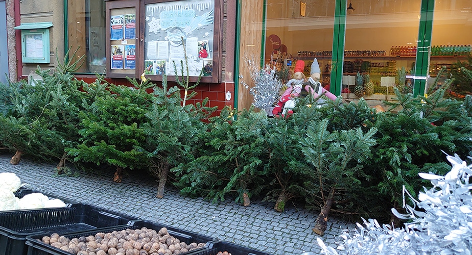 横の小道を進むと小さな雑貨店のようなカラフルな八百屋さんの店先に小さなモミの木が並び、横には金や銀でコーティングされたデコレーション用の枝や葉がぎっしりと積まれ手に取ってもらえるのを待っています。