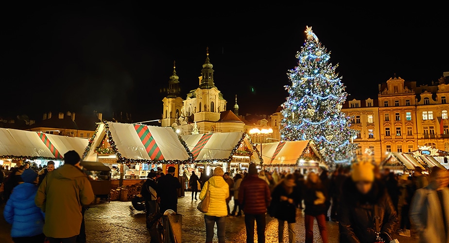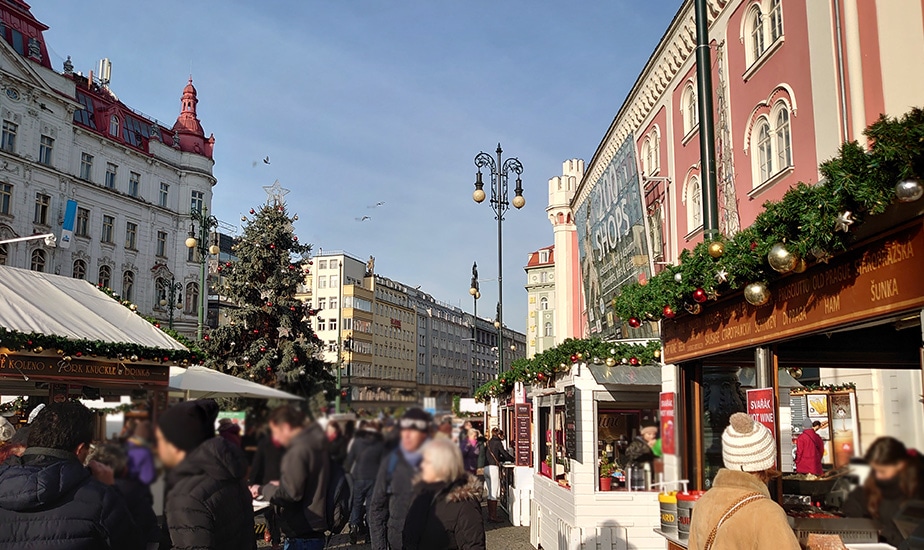 チェコの最後の食事を広場のクリスマスツリーの前でプラハ名物のトゥルデルニークでしめくくった旅でした。