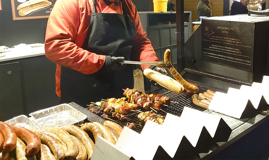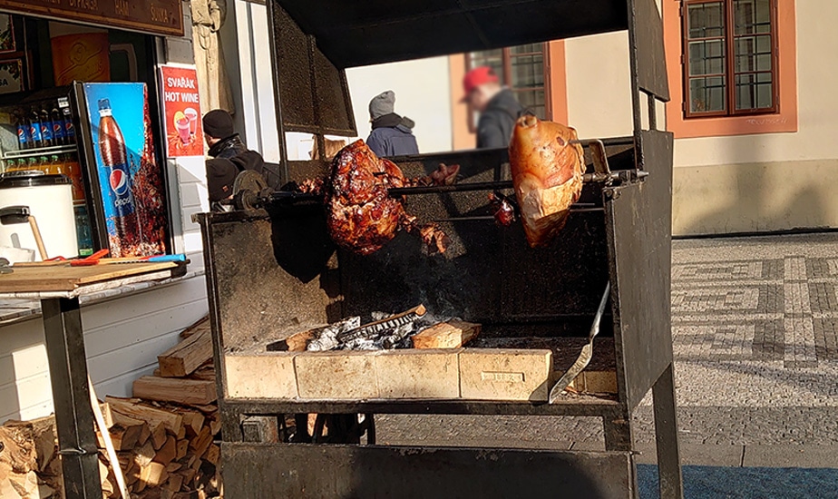 大きな塊のお肉の真ん中に長い鉄の棒をグサリと刺して火にかざしてぐるぐる回しながら丸焼きにしていくようです。あまりの豪快さとお肉が焼ける美味しそうな匂いについ引き寄せられていきました。チェコビールとよく合うんだろうな。。。
