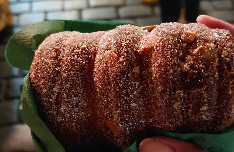 細長く伸ばした小麦粉の生地(おそらくイースト入り)を直径5㎝ほどの鉄の棒に巻きつけ、火であぶってこんがり焼きあげ、シナモンシュガーをたっぷりまぶした菓子パンです。